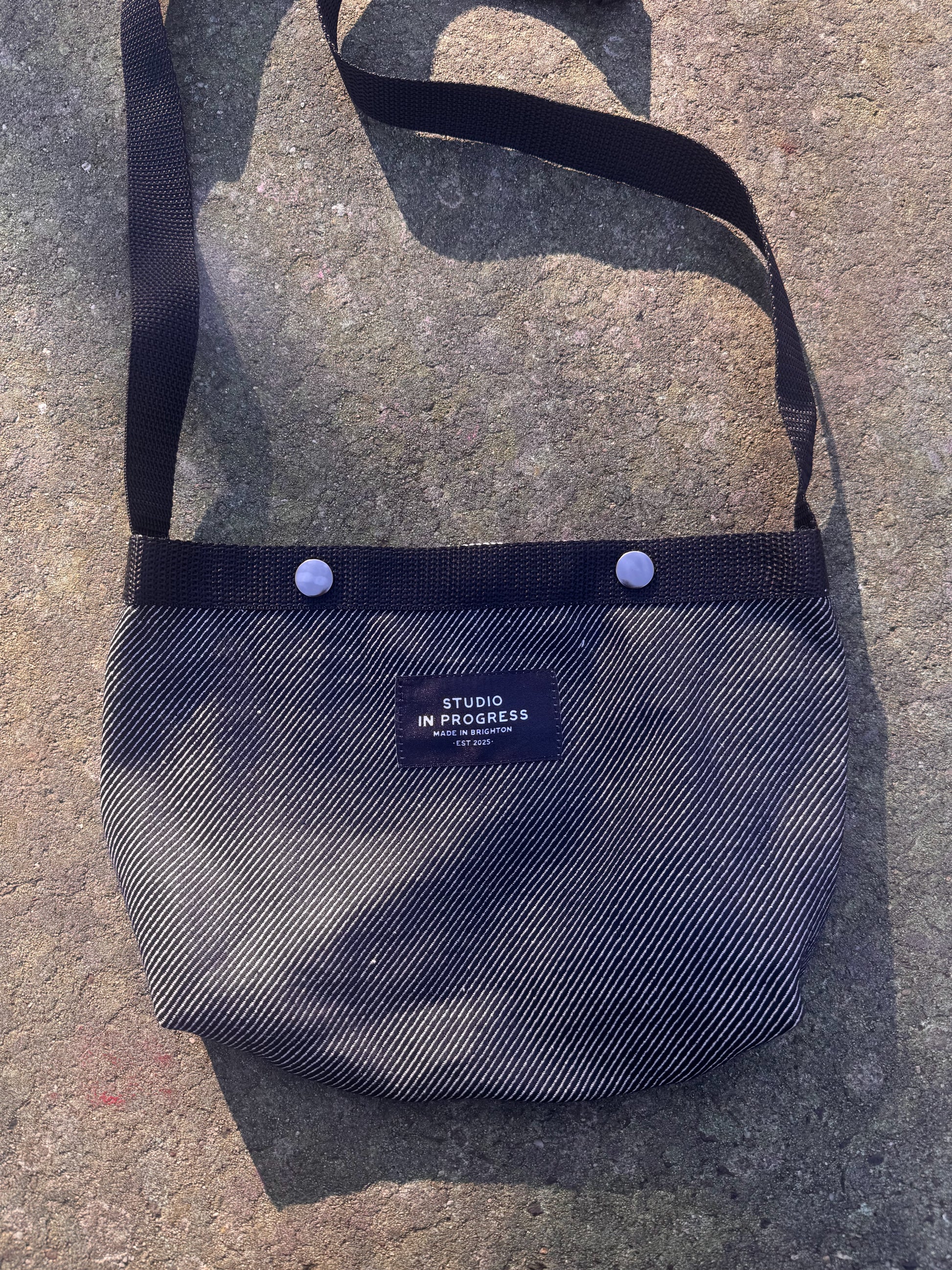 A special edition market bag, measuring 16cm wide by 20cm tall, snap popper closure and an adjustable strap from approx 60cm -100cm. A simple design, just big enough for your daily essentials. Made from secondhand fabric remnant.