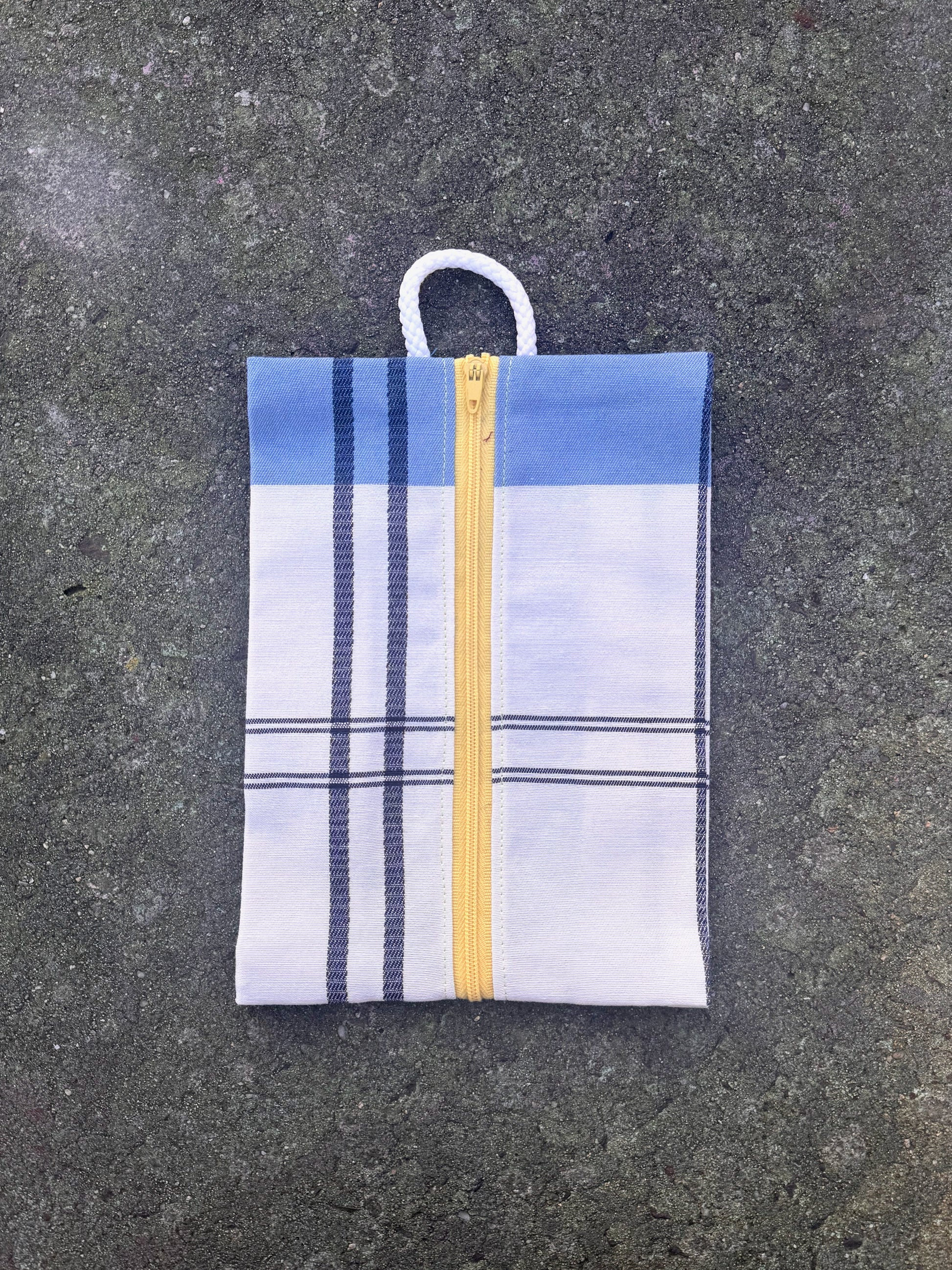 Large zip pouch measuring 15cm x 20cm, featuring pleated sides for expanding when full. Made from a variety of reclaimed fabric including canvas tent, curtains, tablecloths, upholstery remnants and duffle bags. Select which variation you would like from the options below.